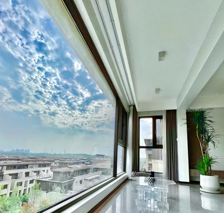 阳台大玻璃直接带来的好处,就是光线足。早上起床,阳光透进屋里,屋子瞬间明亮。**傍晚拉开窗帘看外面,风景一览无余,心情也跟着放松。**尤其是高层住户,整个视野都开阔,感觉屋子大了不止一点点。