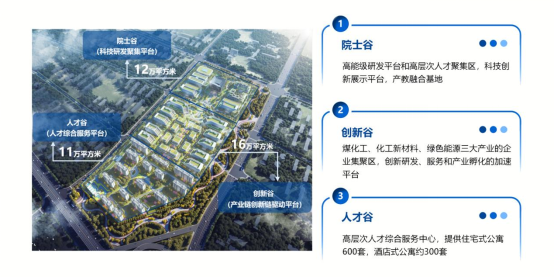 功能布局上,建设“院士谷、创新谷、人才谷”三大功能区,集成研发办公、实验检测、小试生产、院士/博士工作站、会议展示等八大功能。
